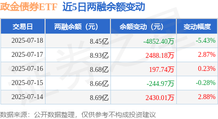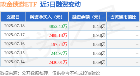 本站消息,7月18日,政金债券ETF(511520)融资买入9433.03万元,融资偿还1.43亿元,融资净卖出4852.4万元,融资余额8.45亿元,近20个交易日中有14个交易日出现融资净买入。