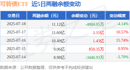 本站消息,7月18日,可转债ETF(511380)融资买入5.34亿元,融资偿还5.83亿元,融资净卖出4841.18万元,融资余额9.74亿元。